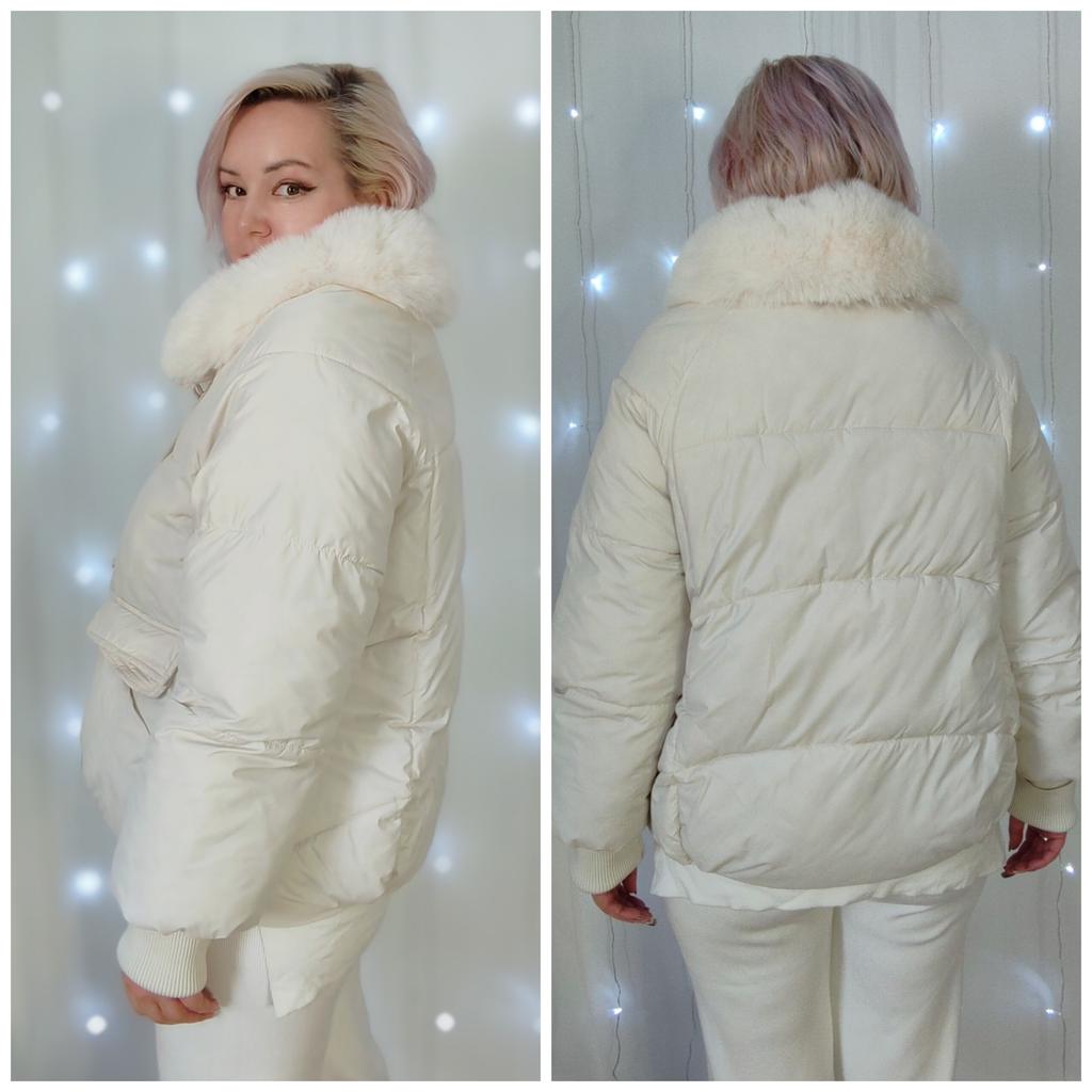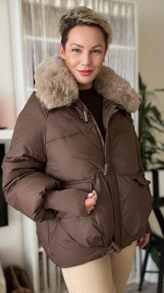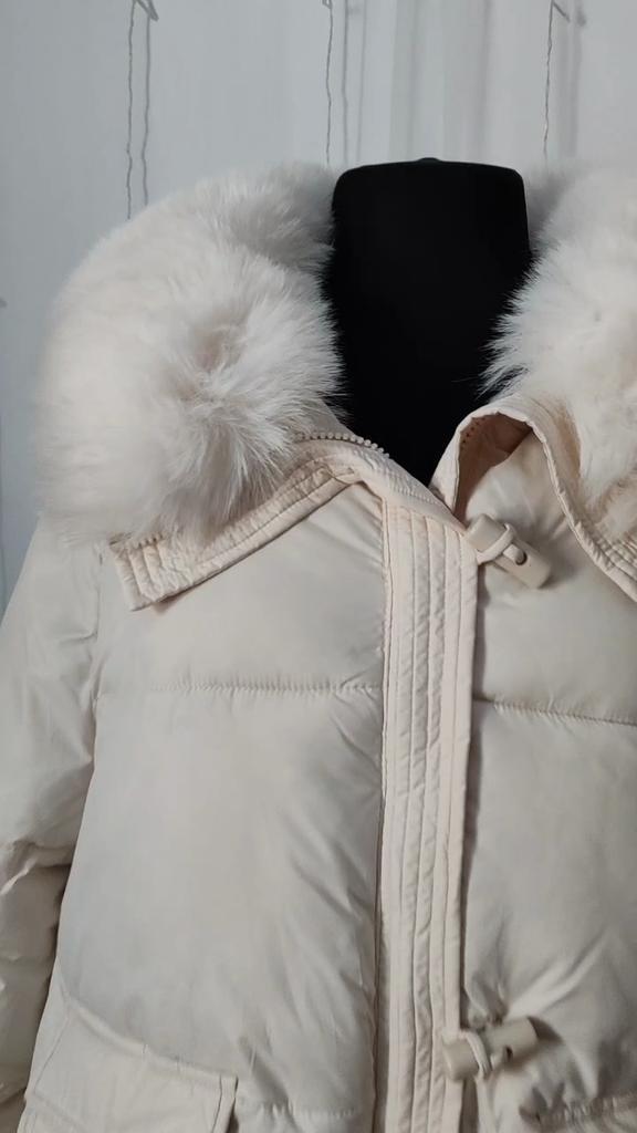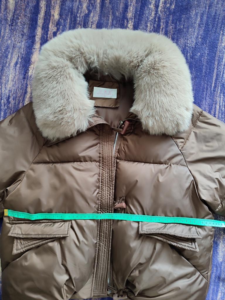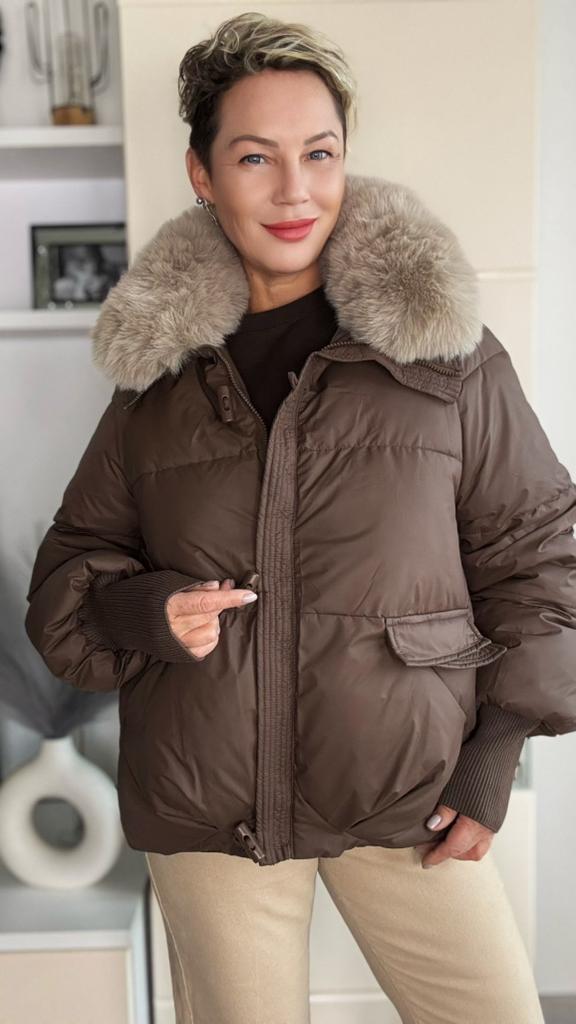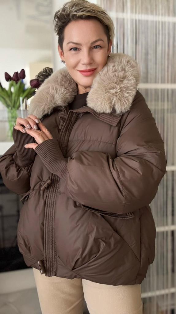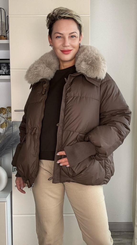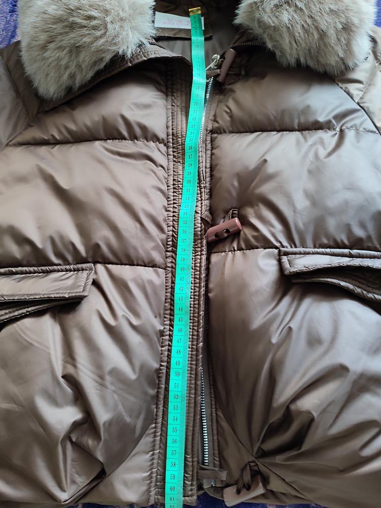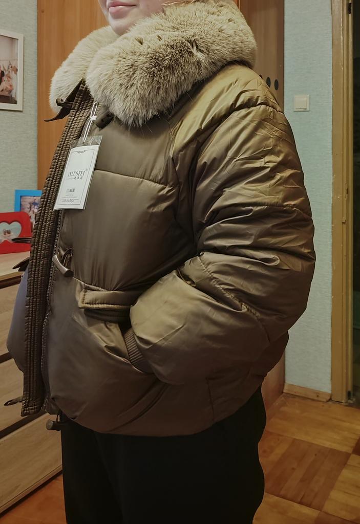The jacket fully corresponds to the size and the seller's promotional photo. The quality is good. The filling is santepon, distributed evenly. The upper fabric is of good quality, slightly rustling, the color is very beautiful, milk chocolate. The lining is also of good quality, not cheap. The lock is plastic, painted like metal. The collar is turned up, the fur looks very decent. The cuffs on the sleeves are made of high-quality knitwear. I am very, very satisfied with the product. Thank you.🤎 PS: thanks for the gift, this is the third one from this seller, but it's very nice. I'll add: the attached collar gets very tangled and ruffled around the neck, which upsets me, and it will lose its decent appearance in a short time.🤨