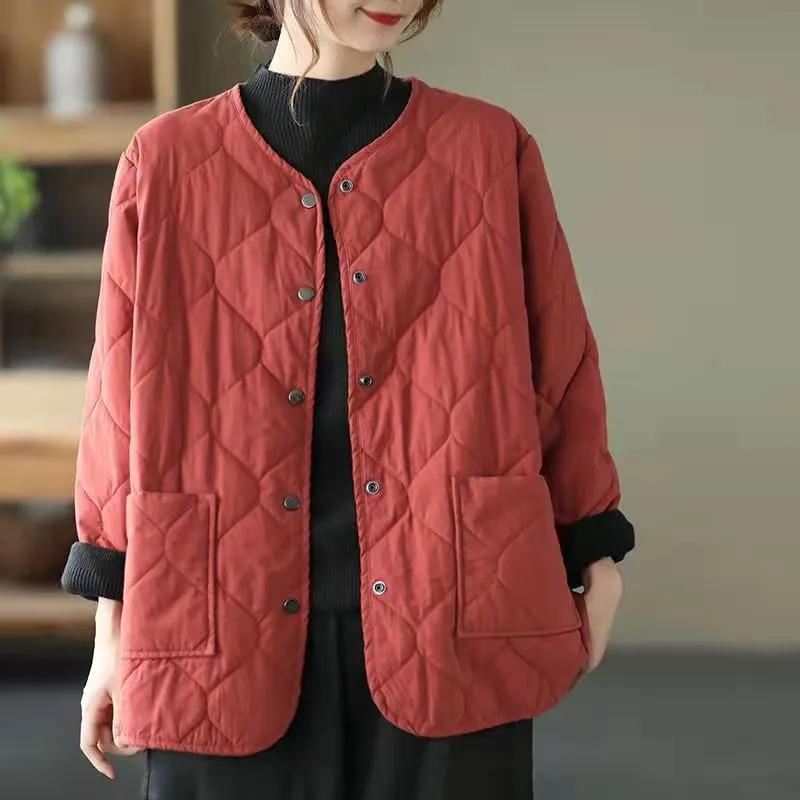 Autumn Winter Mom Loose Women Short Jacket Cotton Padded Casual O-Neck Coats Fall Button Up Solid Thin Parkas Pockets Clothes