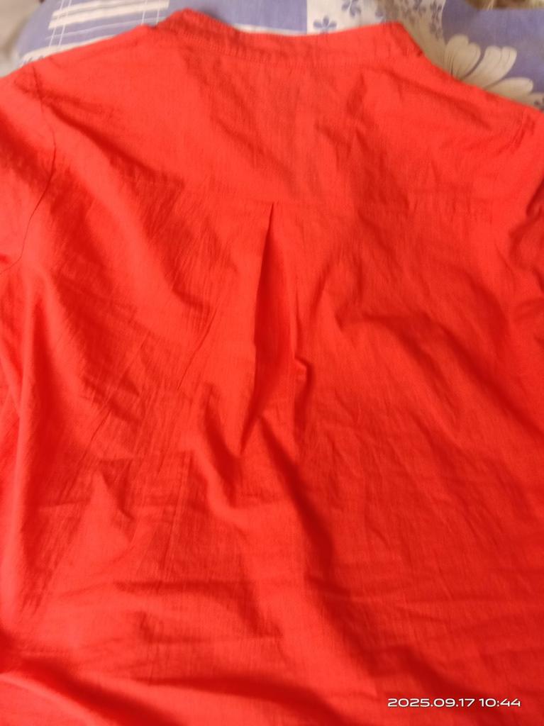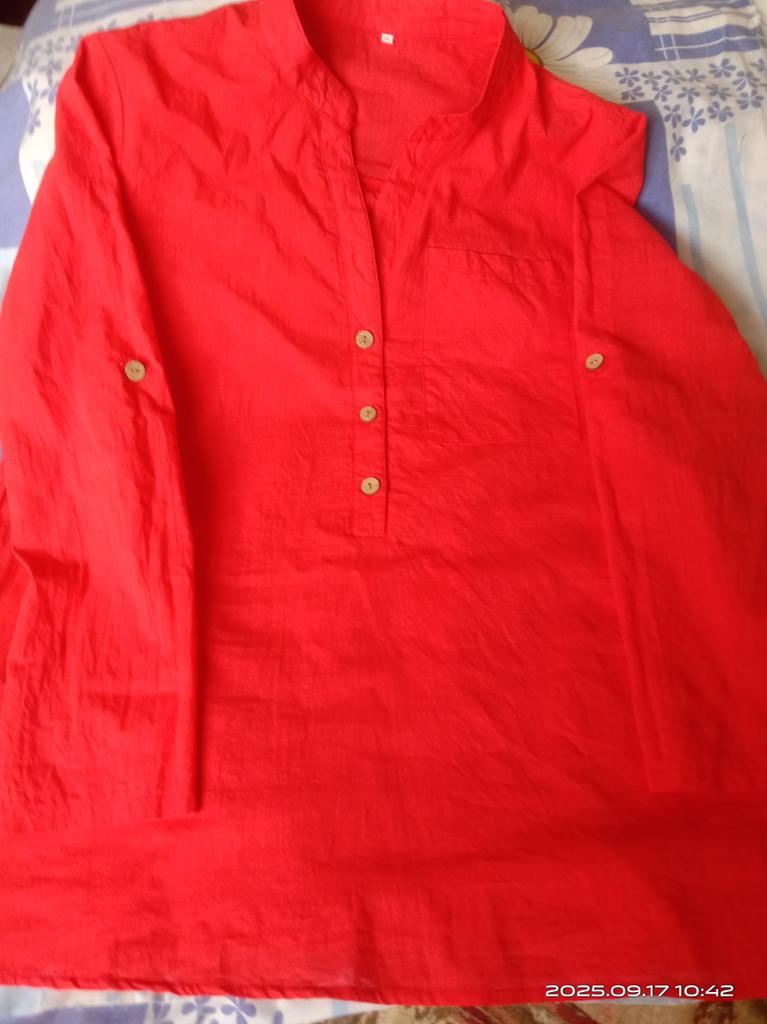 The blouse is well sewn, the color is a delicate red, cotton, not see-through, the color doesn't run when washed, for parameters bust 118cm, with a margin, overall length, a bit long and the sleeves, but can be adjusted. Thank you to the store.