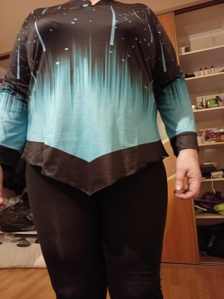 Terrible quality, the bottom is very wide, sticks out stiffly on the stomach, a bit narrow in the shoulders. The seams are white on black, they show through. The sleeves are very narrow.