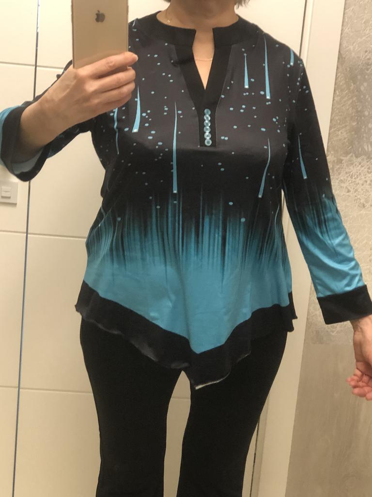 For my size 58, I took 5XL. Just right. The blouse is pleasant, beautiful. I recommend it. Thank you for the product.