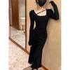 Fashion Long Sleeve Square Collar Sexy Dress Women Summer Drawstring Waist Casual Fishtail Dresses Women Elegant Temperament Slim Fit Long Dress 25994