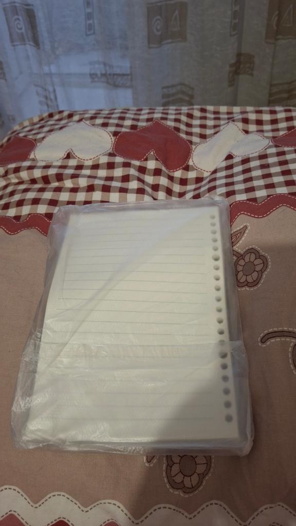 The cover consists of 2 parts of transparent thick plastic and thin paper with color printing. 60 lined sheets, line spacing 9 mm, paper slightly thicker than for a printer, yellowish.