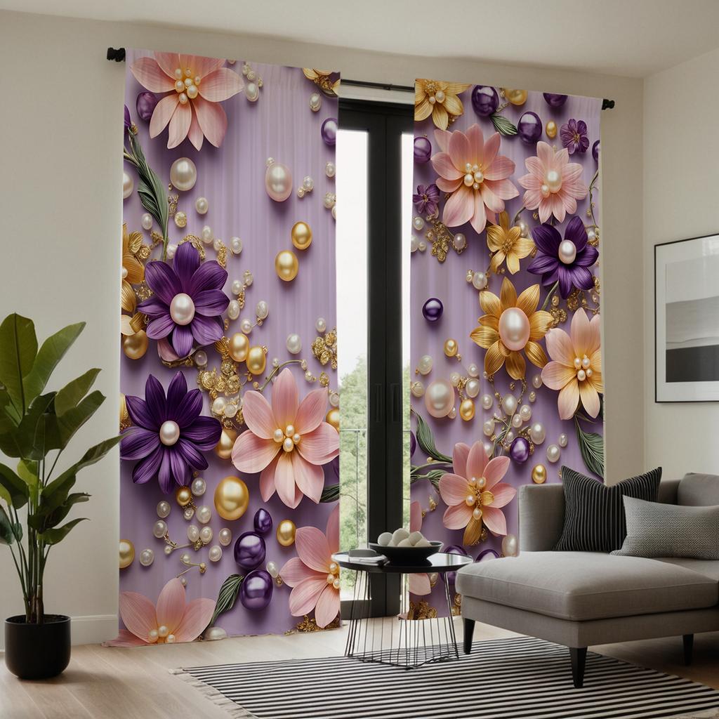 2pcs HD Stereo Pearl Flower Decoration Curtain Pink Tie Digital Printed Curtain Home Decoration Style Decoration Living Room