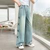 Girls' Summer Thin Side Seam Embroidered Bowknot Jeans Loose Straight Wide Leg Denim Pants Teenagers Pure Color Washed Trousers