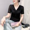 Sexy V-neck Mesh T-shirt for Women's Short-sleeved Summer Design Beaded Top Fashionable and Versatile Half-sleeved T-shirt Small Shirt