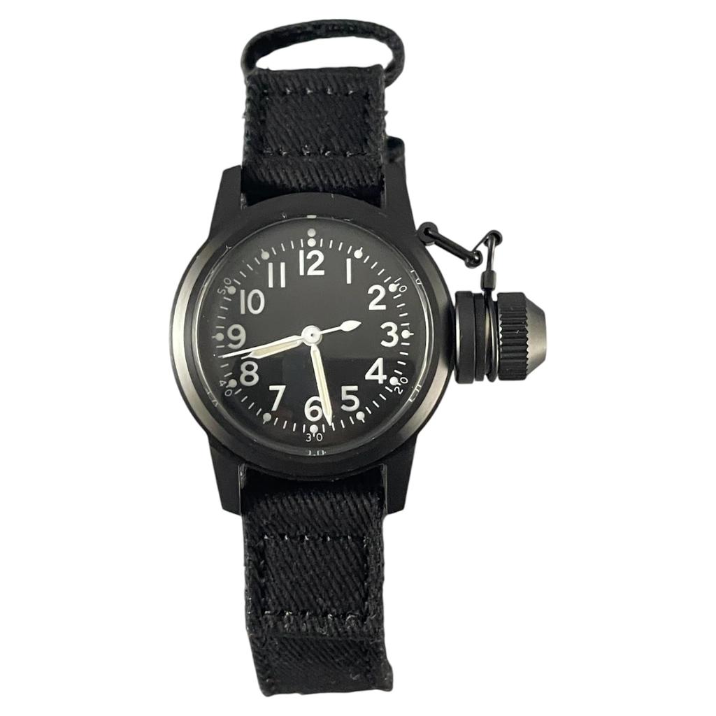 Buships is a watch developed for the U.S. Navy's UDT underwater bombing team in the 1940s. We have faithfully reproduced this distinctively shaped clock for ease of use. The small body and large crown cap may seem unbalanced at first glance, but the waterproof system using this large crown cap was indispensable for diving operations at the time. 70 years after its development, the UDT has evolved into the U.S. Navy SEALs, and this retro design has always been a popular item among military watches. Due to its special shape, it has been loved by many people for many years, so much so that it is nicknamed the "Cantain" water bottle. The mission of the UDT was to hide behind the enemy and sneak in from the sea, then plant explosives to eliminate obstacles that would get in the way of landing the following allies. Therefore, I hear that even if they were captured in enemy territory, they did not bring anything that could identify them. In reality, black-colored Buships did not exist. Black Ops is an abbreviation for Black Operation, meaning an unofficial operation (black operation, black op, black ops). A stainless steel case with black IP coating, black dial, and white indexes.