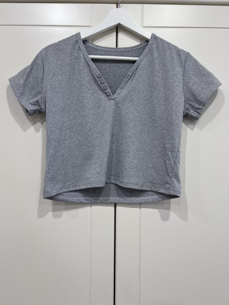 Beautiful V-neck T-shirt with buttons, summer top ๐๐งฅ๐ ๐Delivery time ๐: 13 days to Germany. ๐Scope of delivery ๐: Included in the delivery is a T-shirt in the corresponding size. This product is only available in this color. It is available in sizes S to 2XL.. I ordered it in gray in size XL, and the top ๐ฅผ fits me well. It fits me perfectly, which I really like. I could have ordered a size smaller. The shirt is soft and comfortable against the skin, and opaque. ๐. Very, very soft!! The buttons in the chest area can be completely undone and unbuttoned. ๐๐๐๐ซถ๐ซถ๐ซถI normally wear a size S (36). I weigh 55 kg and am 167 cm tall. My measurements are 90-65-90 cm, 167 cm tall.. QUALITY ๐: The top is of excellent quality, warm, very well made, without any unpleasant chemical smell. ๐๐ The shirt is perfect for all seasons. Regarding the material composition: Polyester. The fabric is very comfortable against the skin. It feels like cotton.. โฌ๏ธโฌ๏ธโฌ๏ธSummary: Beautiful top of excellent quality ๐งฅ๐๐๐๐It runs small. You need to order at least 2 sizes larger.. Thank you Joom and the seller! 5 Stars! ๐ I am happy to recommend the product!๐๐๐๐๐โ ๏ธ๐