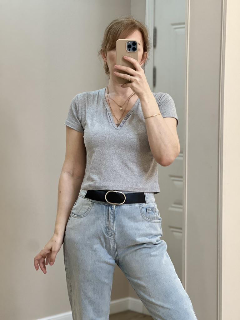 * Crop top with mega neckline * ๐ฅ๐๐ถ๐ฒ๐ณ๐ฒ๐ฟ๐๐ฒ๐ถ๐ 5 weeks ๐ฅ๐๐ถ๐ฒ๐ณ๐ฒ๐ฟ๐๐บ๐ณ๐ฎ๐ป๐ด Included in delivery is one shirt in the corresponding color and size. It is available only in gray in sizes S to XXL. I ordered this in size S in grey. It fits me perfectly๐ I usually wear a size 36 to 38. I am 172 cm tall. My measurements 95-65-95 cm ๐ฅ๐ค๐๐ฎ๐น๐ถ๐รค๐ The t-shirt is NOT transparent . The fabric is very soft and perfect for summer. The V-neck is cut deep and has a decorative button placket. The T-shirt is totally elastic. The T-shirt fits me belly-free, but I like it very much. I find the length perfect for my height of 172 cm. OK For material composition : Unknown, as I couldn't find a label, but I suspect polyester ๐ฅ๐๐ฎ๐๐ถ๐ Cute T-shirt with a very soft fabric that creates a mega cool cleavage. Size S is a bit smaller, but it accentuates the curves nicely. โญโญโญโญ If my review and photos / images have helped you with your purchase decision, I would be happy if you follow me here on Joom for many more reviews to come ๐ ๐ฒ๐โค๏ธ