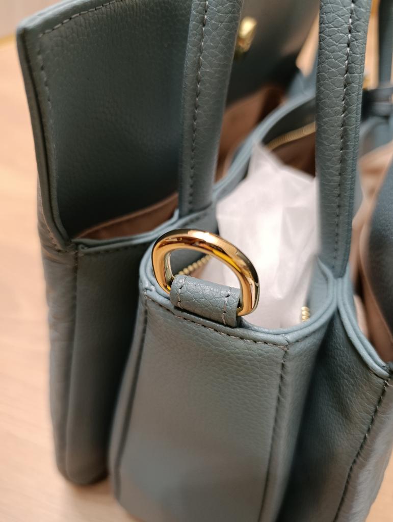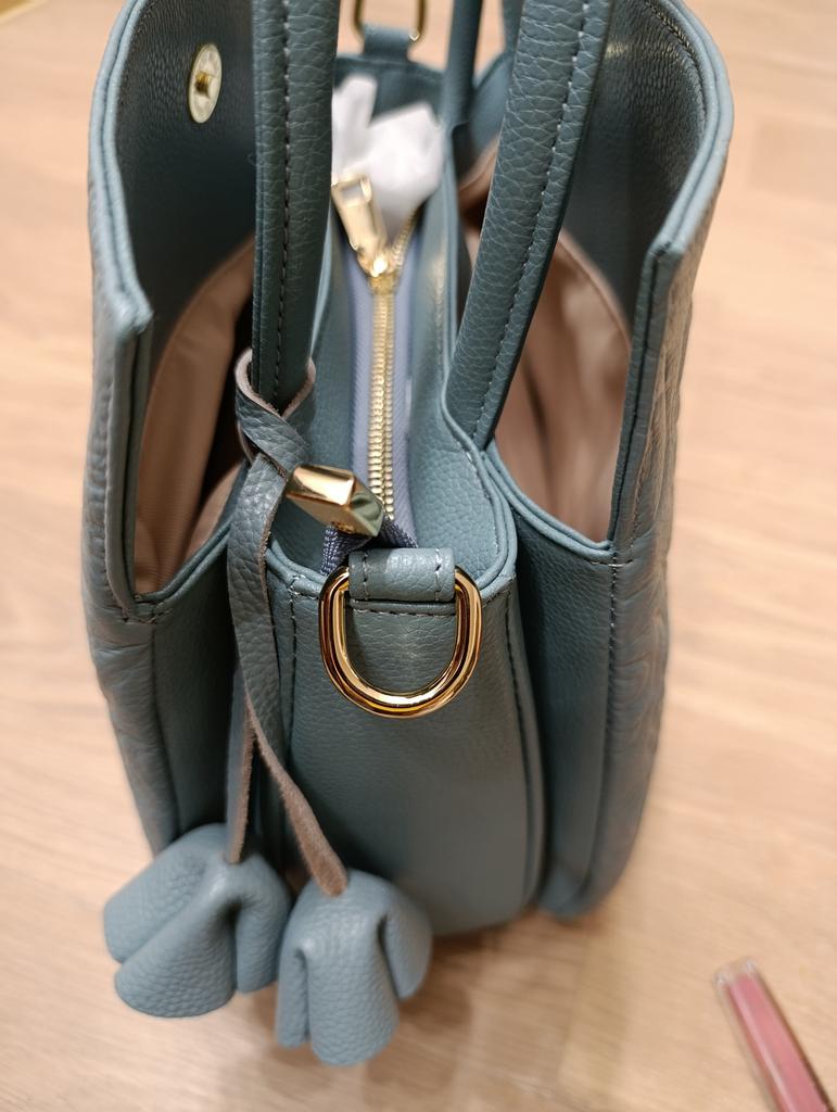 The bag has 3 compartments. Gold-colored hardware on the blue bag.
