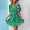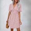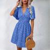 GMXIA Women's Summer V-Neck Midi Sleeve Printed High Waist Floral Pleated Dresses