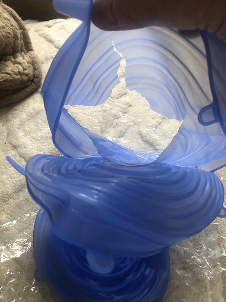 The outer package is damaged and taped shut. But everything inside is okay: 12 orders in their own little bags. The lids are soft. I hope they are also stretchy