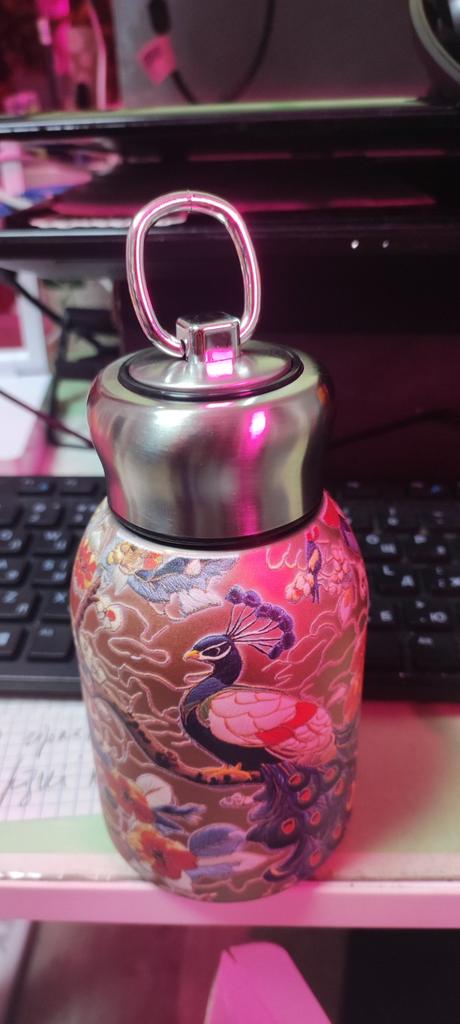 Peacock Pattern Vacuum Cup Stainless Steel Vintage Flower Thermal Water Bottle 300ml Double-Layer Insulation Glass Tea Pot with Leakproof Lid