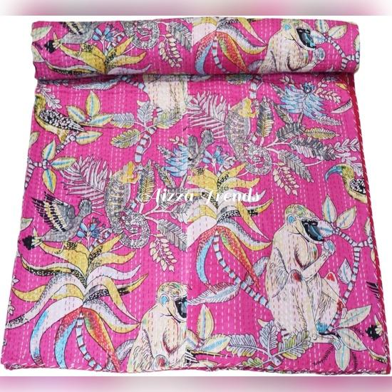 which makes it unique and full of character.Vibrant Kantha Quilt: Handcrafted with intricate floral and bird motifs in a vivid yellow and pink color scheme, this quilt exudes warmth and artistry.Hand-stitched Kantha Blanket.Kantha Stitching-The quilt features traditional Kantha stitching, a vintage style of hand-embroidered running stitchesSize: Ideal for use on a bed, sofa, or as a blanket for a cozy touch, offering both aesthetic value and comfort.Unique Stitching: Each quilt features the traditional 'kantha' running stitch, a centuries-old embroidery technique passed down through generations.Decorative & Versatile: Its colorful, intricate designs make it perfect for use as a bed cover, throw, or even a decorative beach blanket.Lightweight Yet Cozy Crafted from layers of soft, breathable cotton fabric, it provides just the right amount of insulation for year-round comfort. Traditional Look: The quilt’s design reflects a vintage, ethnic style, making it a perfect addition to a rustic, bohemian, or Indian-inspired interior.Lightweight Kantha Blanket,,Indian Kantha Throw,Traditional Kantha Bedspread,Vintage Kantha Blanket,Cotton Kantha Quilt,Reversible Kantha Quilt,Bohemian Kantha Throw.