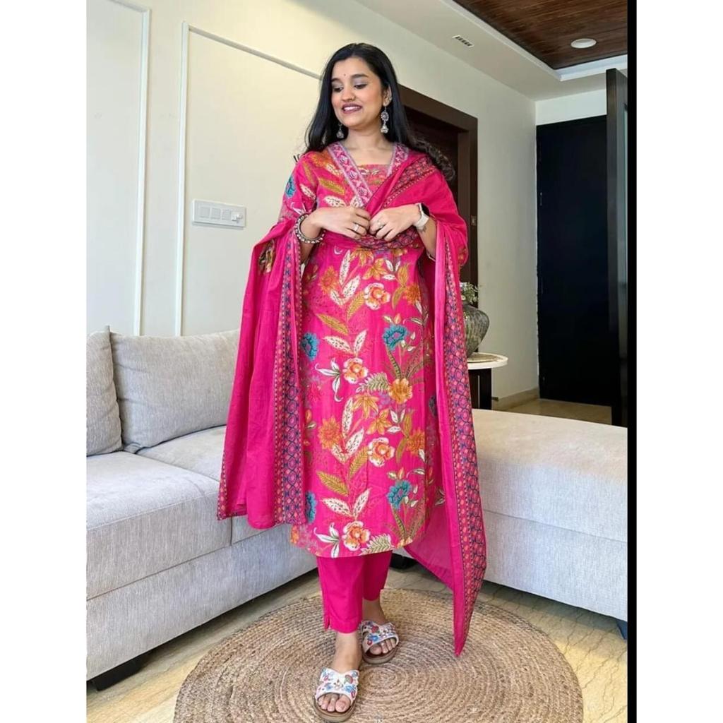 Indian Designer Cotton Kurta Pant Dupatta Set Women Bollywood Top Tunic Kurti VF-20224