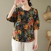 Cotton and Linen Printed Shirt, Round Neck, Short-sleeved T-shirt, Women's Loose Mother's Wear