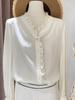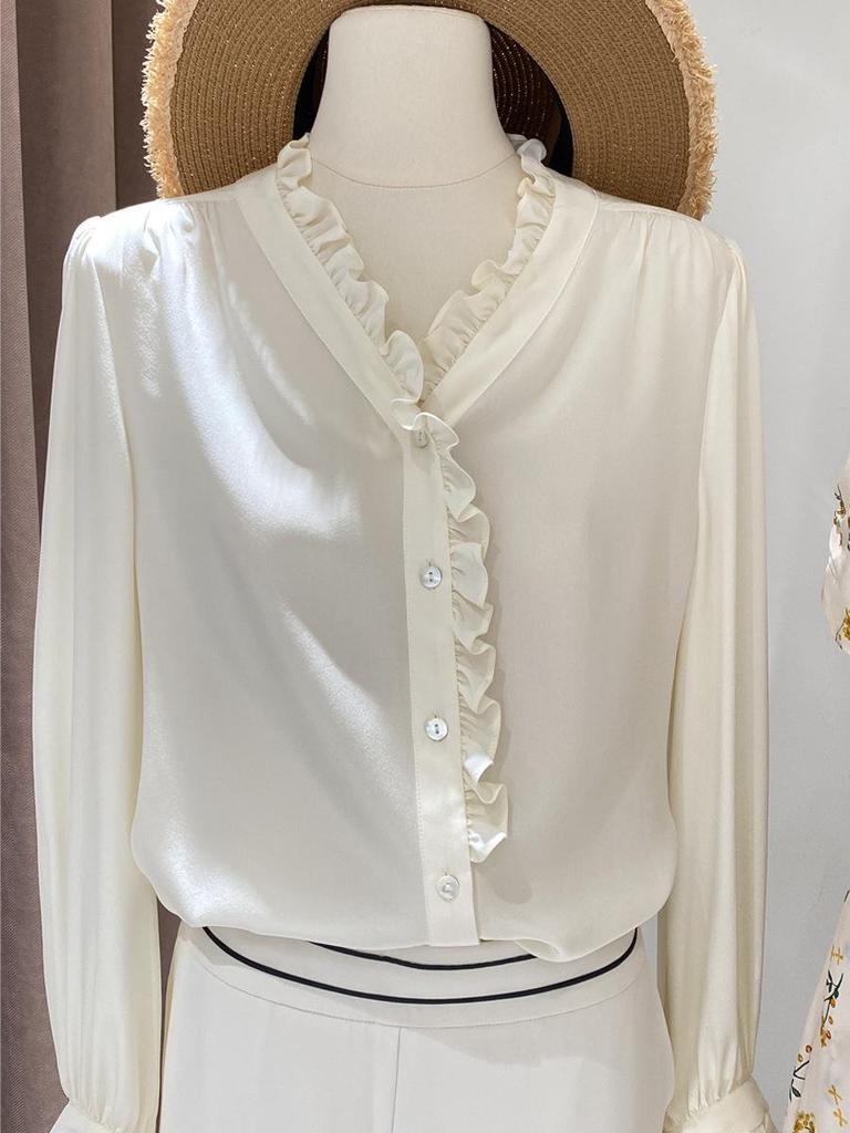 2025 Early Spring Women's French Double Crepe White Lace Shirt - 100% Mulberry Silk