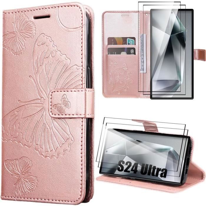 Protective Case - BOOLING - for Samsung Galaxy S24 Ultra - PU Leather - Pink Butterfly Pattern - 2 Tempered Glasses