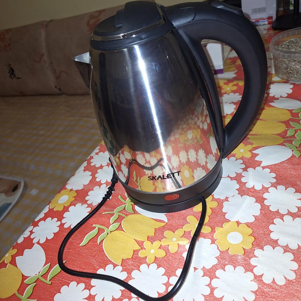 The kettle works. There are minor scratches, no dents. The cord is very short, about 38cm. Automatic shut-off upon reaching 100 degrees works correctly. The plastic smell is significant, after boiling 5 times the smell did not go away.