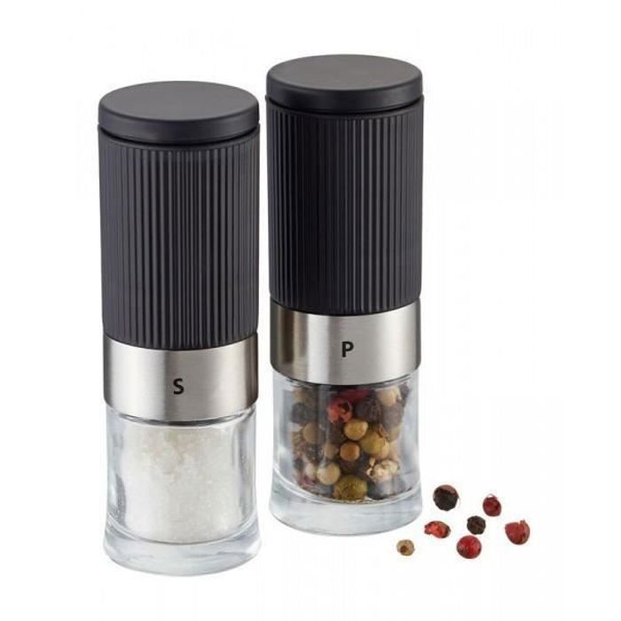 Set salière et poivrière - gefu - tusome - verre et plastique noir - réglable - support noir