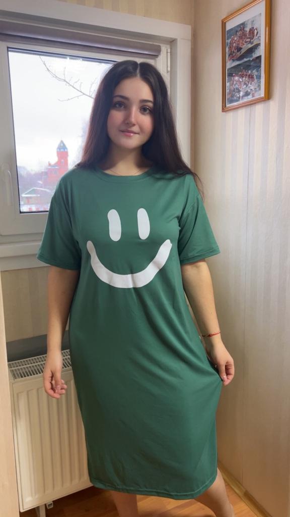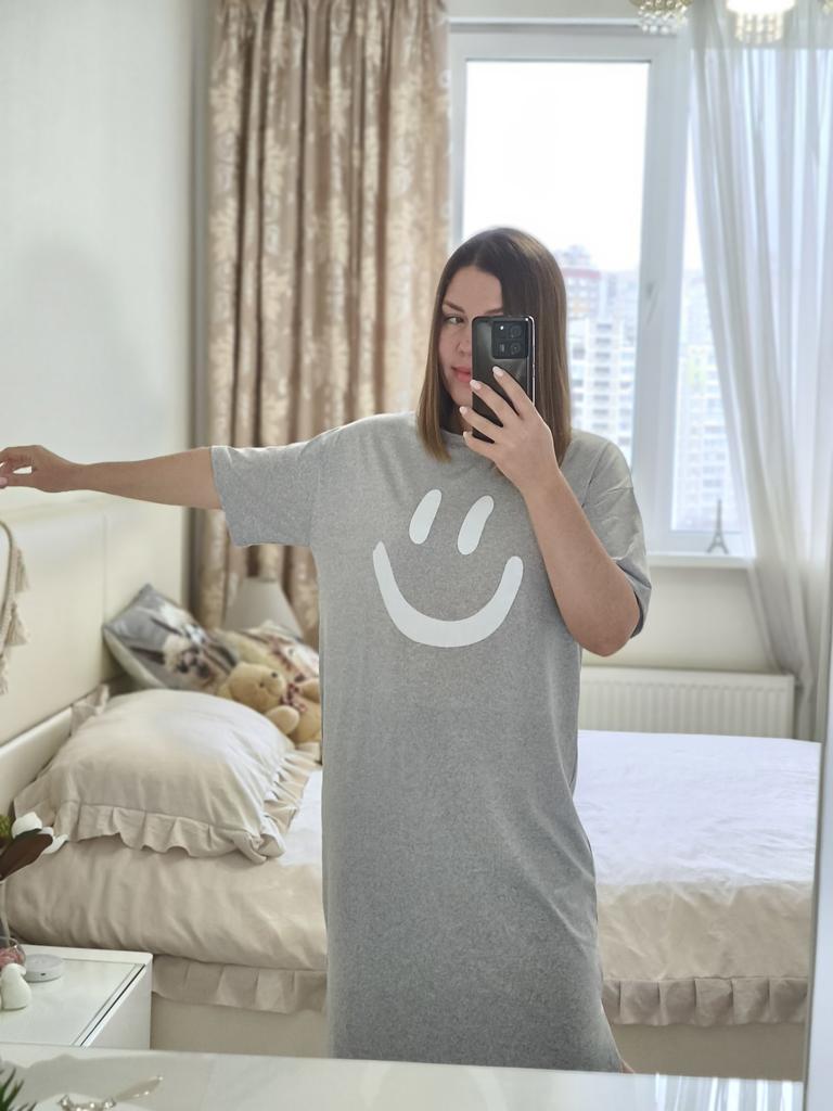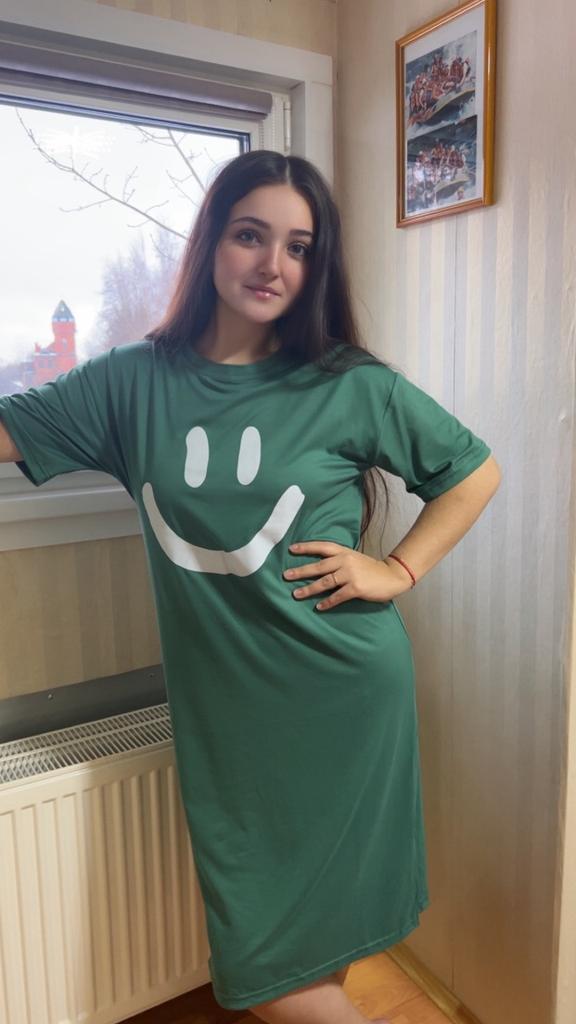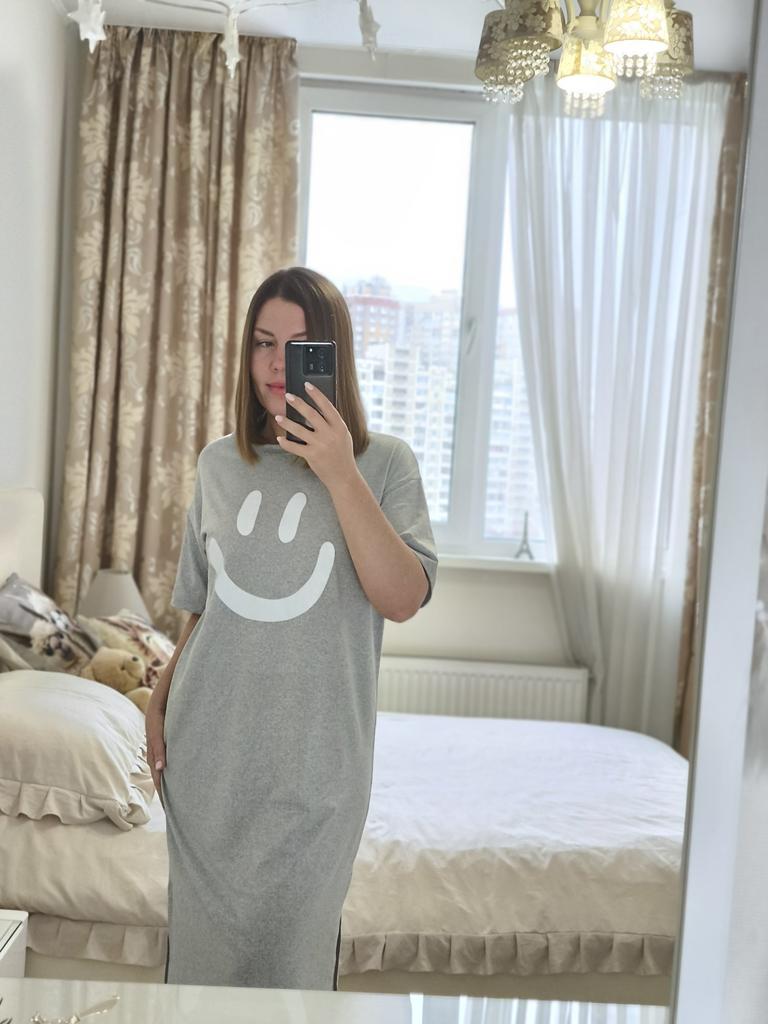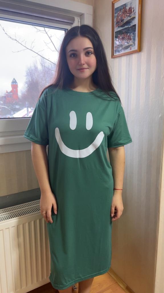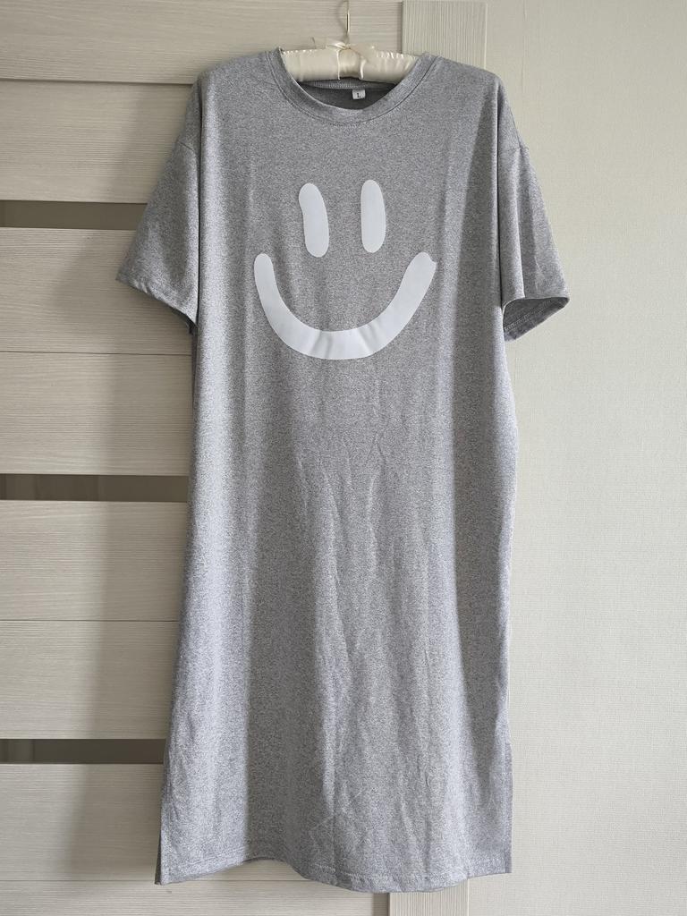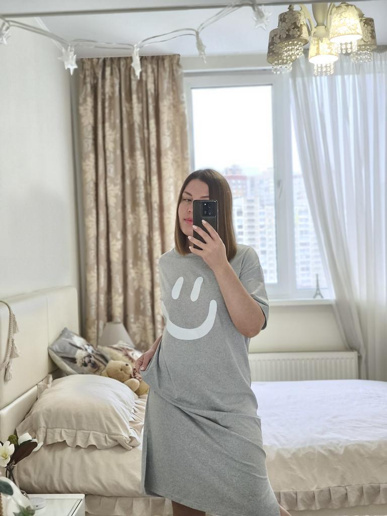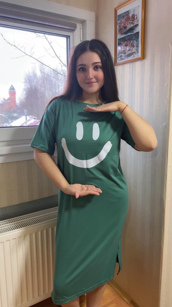 T-shirt dress with a smiley face print. The dress is straight, as befits a t-shirt without pockets and darts. It is decorated with piquant slits on the sides and a print, which I have already mentioned.. Fabric cotton with polyester; flowing, pleasant. Does not wrinkle. Such a dress will work both as a nightgown and for wearing around the house. It looks cute, neat, and very decent👍 Just like a little black dress! I ordered 3XL for parameters 90/80/115.