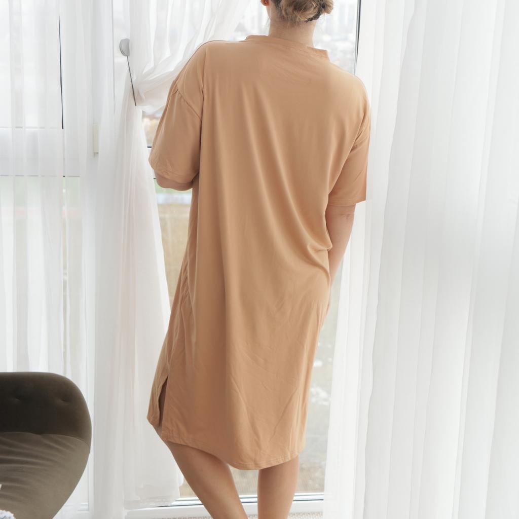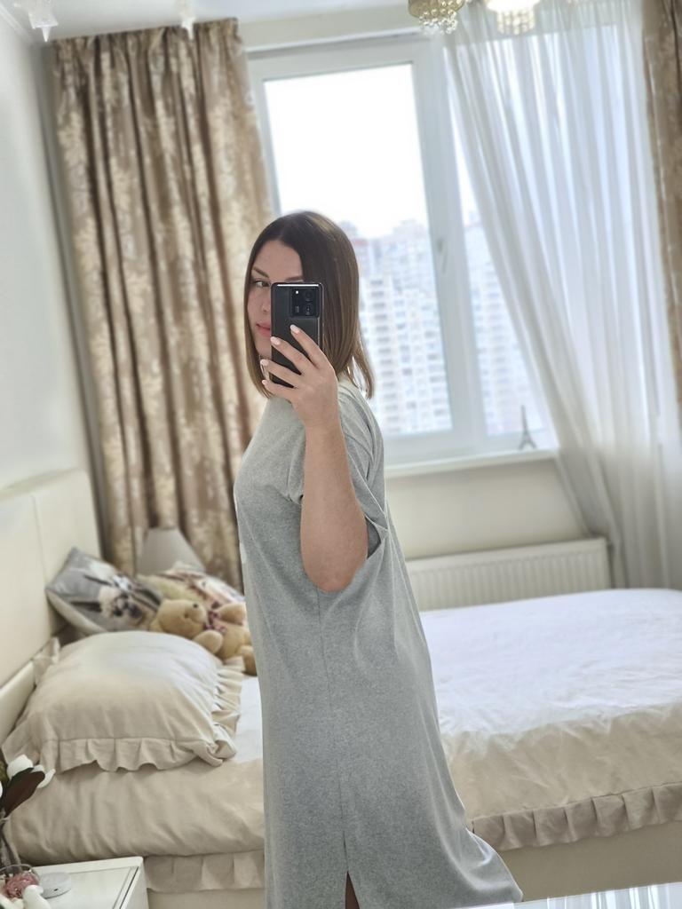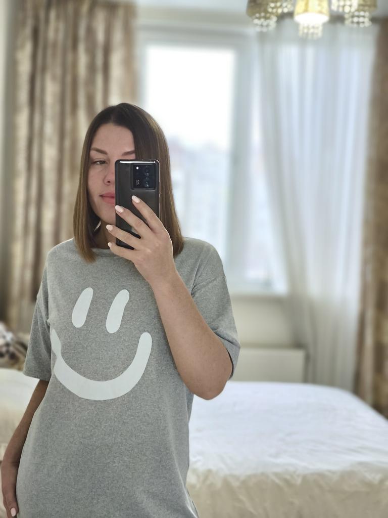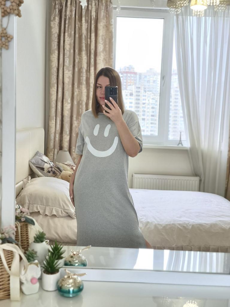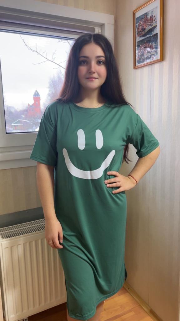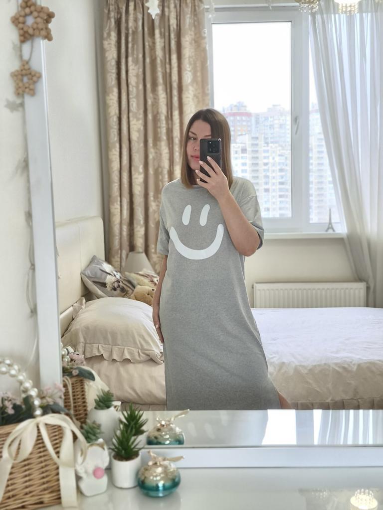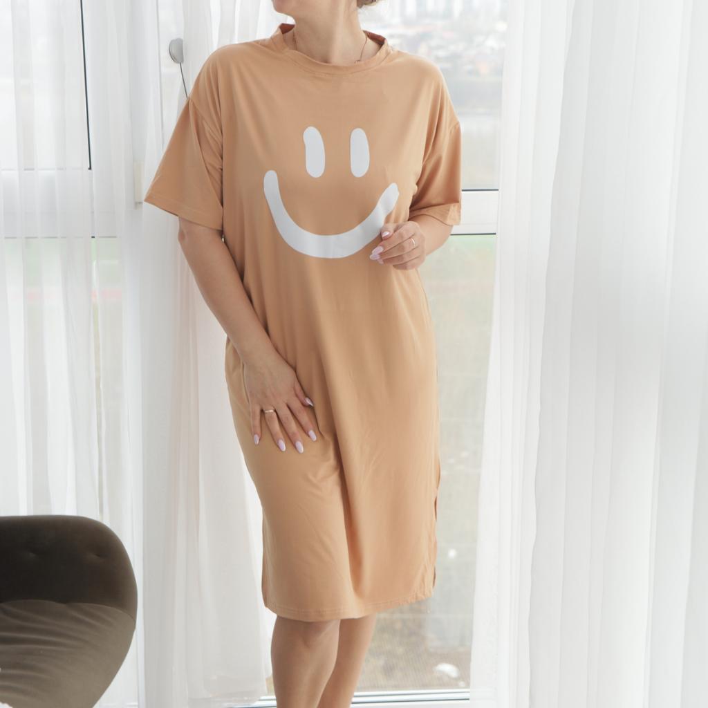T-shirt dress with a smiley face print. The dress is straight, as befits a t-shirt without pockets and darts. It is decorated with piquant slits on the sides and a print, which I have already mentioned.. Fabric cotton with polyester; flowing, pleasant. Does not wrinkle. Such a dress will work both as a nightgown and for wearing around the house. It looks cute, neat, and very decent👍 Just like a little black dress! I ordered 3XL for parameters 90/80/115.