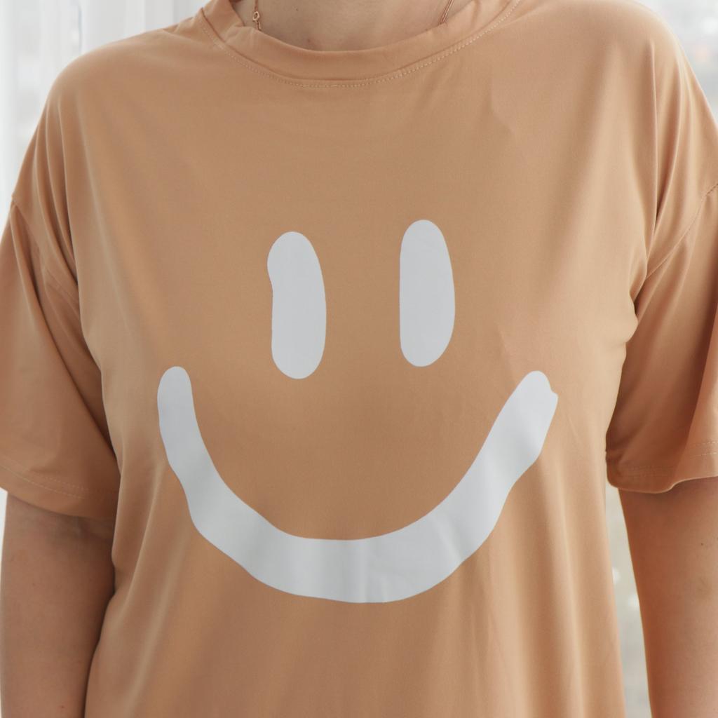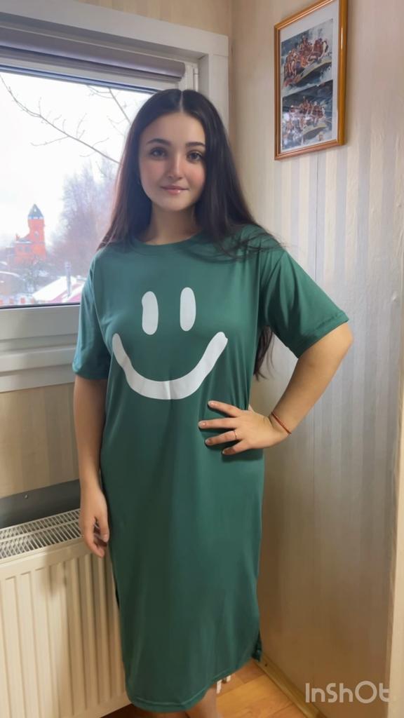 I received this t-shirt dress and it's simply perfect for summer! The fabric is lightweight and very pleasant to the touch, which makes it ideal for hot days. The long length gives a feeling of freedom and comfort, and the H-line cut is very flattering and not constricting. The short sleeves and round neckline add to the casual and relaxing feel, and I really love the loose Korean style – it gives a fresh and sweet look, suitable both for a nightgown and for everyday wear.. The design with the smiles gives the dress joy and character, and it is especially suitable for those looking for a combination of comfort and effortless style. Highly recommend!