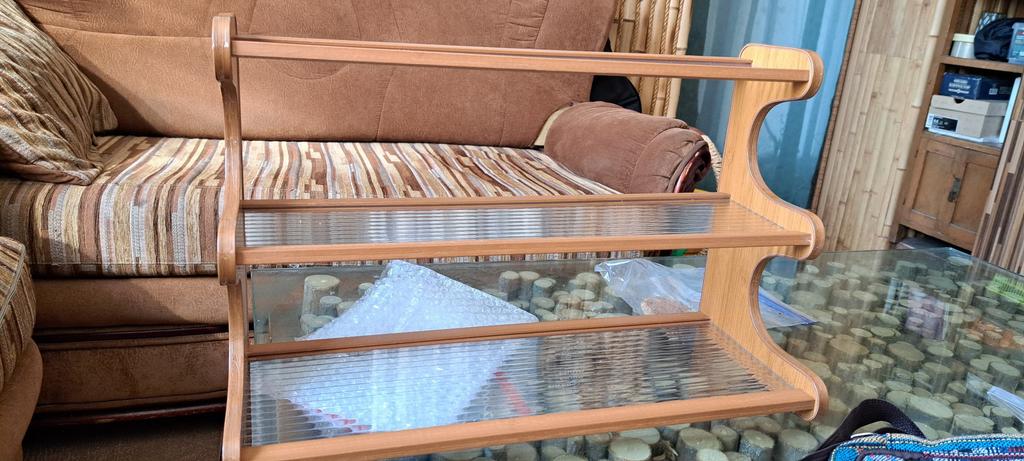 The side part of the shelving unit is laminated plastic, the shelves are thin acrylic glass, the crossbars are bamboo. It is assembled quickly. Fasteners and a key are included in the package. I would like caps for the mounting screws. Overall, acceptable, but considering the materials, the price is too high.
