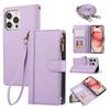 For iPhone 15 Pro Case Multi Card Slots Zipper Leather Phone Cover with Shoulder Strap/Wrist Strap