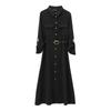 Embrace timeless elegance with this sophisticated midi dress designed for autumn. Featuring a European and American style, this dress is crafted from high-quality polyester, ensuring comfort and durability. The belted waist accentuates your silhouette, while the turn-down collar and long sleeves add a touch of classic charm. Perfect for both casual outings and more formal occasions, this dress effortlessly combines style and versatility.