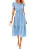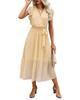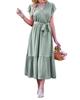 Discover elegance and comfort with this summer-ready V-neck A-line midi dress. Crafted from premium polyester, the dress offers a lightweight and breathable feel perfect for warm weather. Its flattering high-waist design is enhanced by a matching belt, creating a sophisticated silhouette. The pleated detail adds a touch of classic style, making it a versatile choice for both casual outings and special occasions. Embrace timeless fashion with this must-have addition to your summer wardrobe.