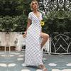 Summer Fall Polka Dot Print Split Long Dress Women Casual V-neck Short Sleeve High Waist Bandage Belt S-XXL