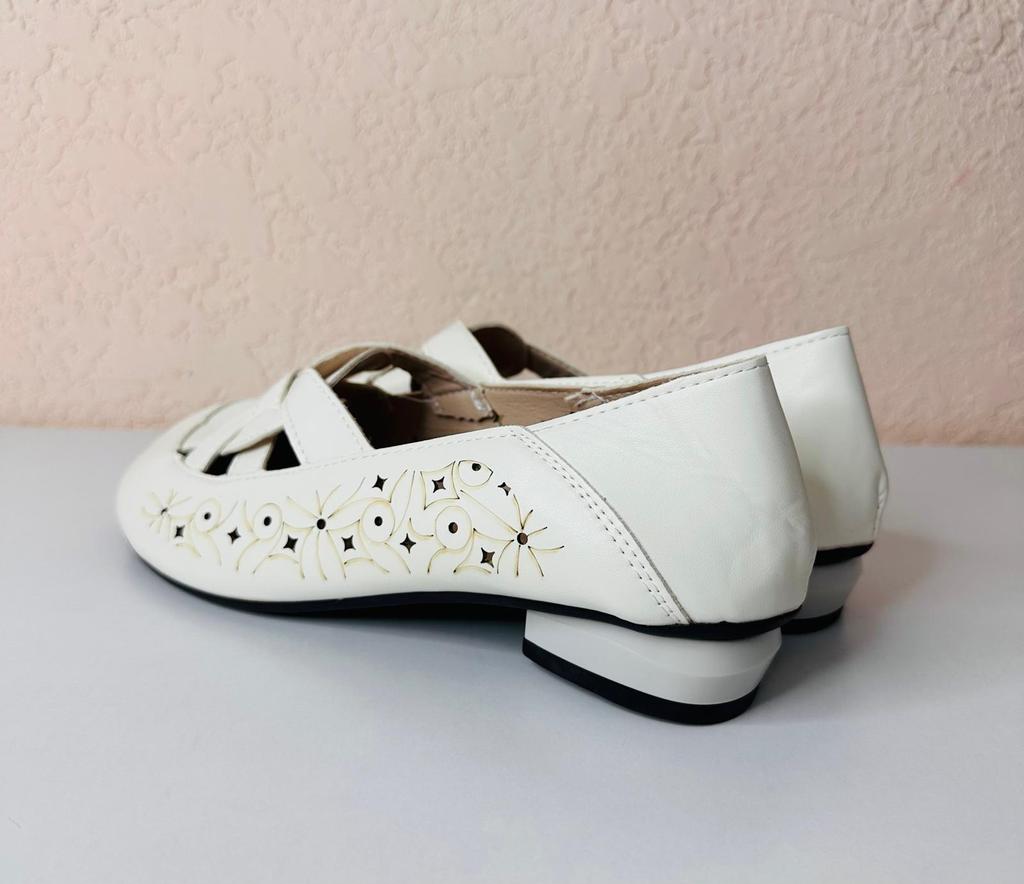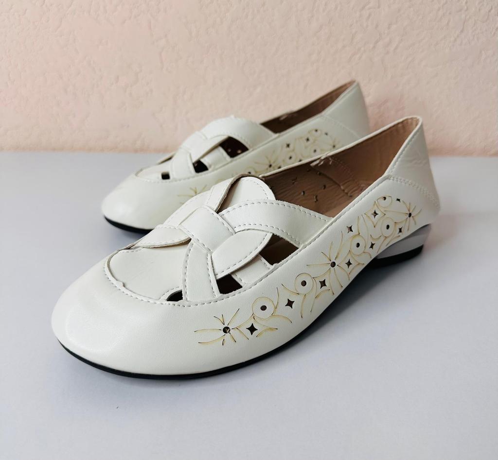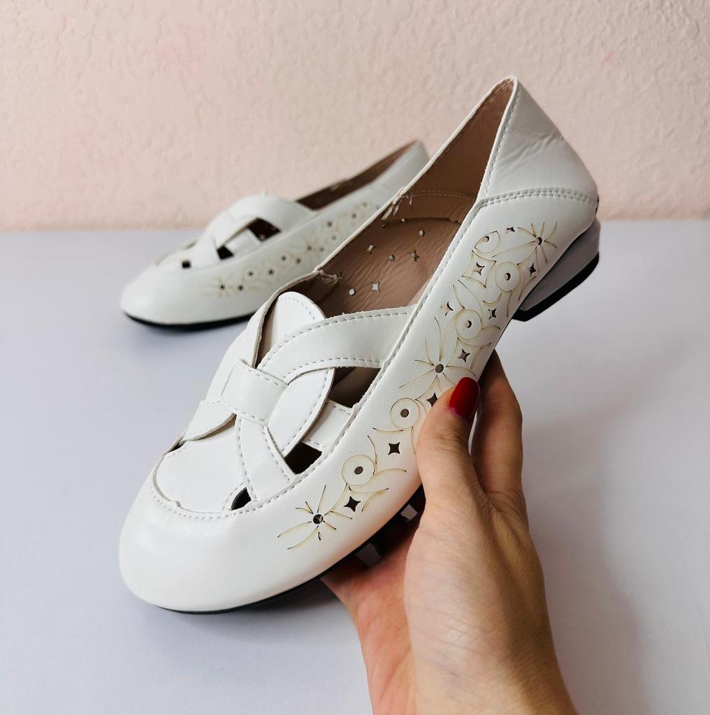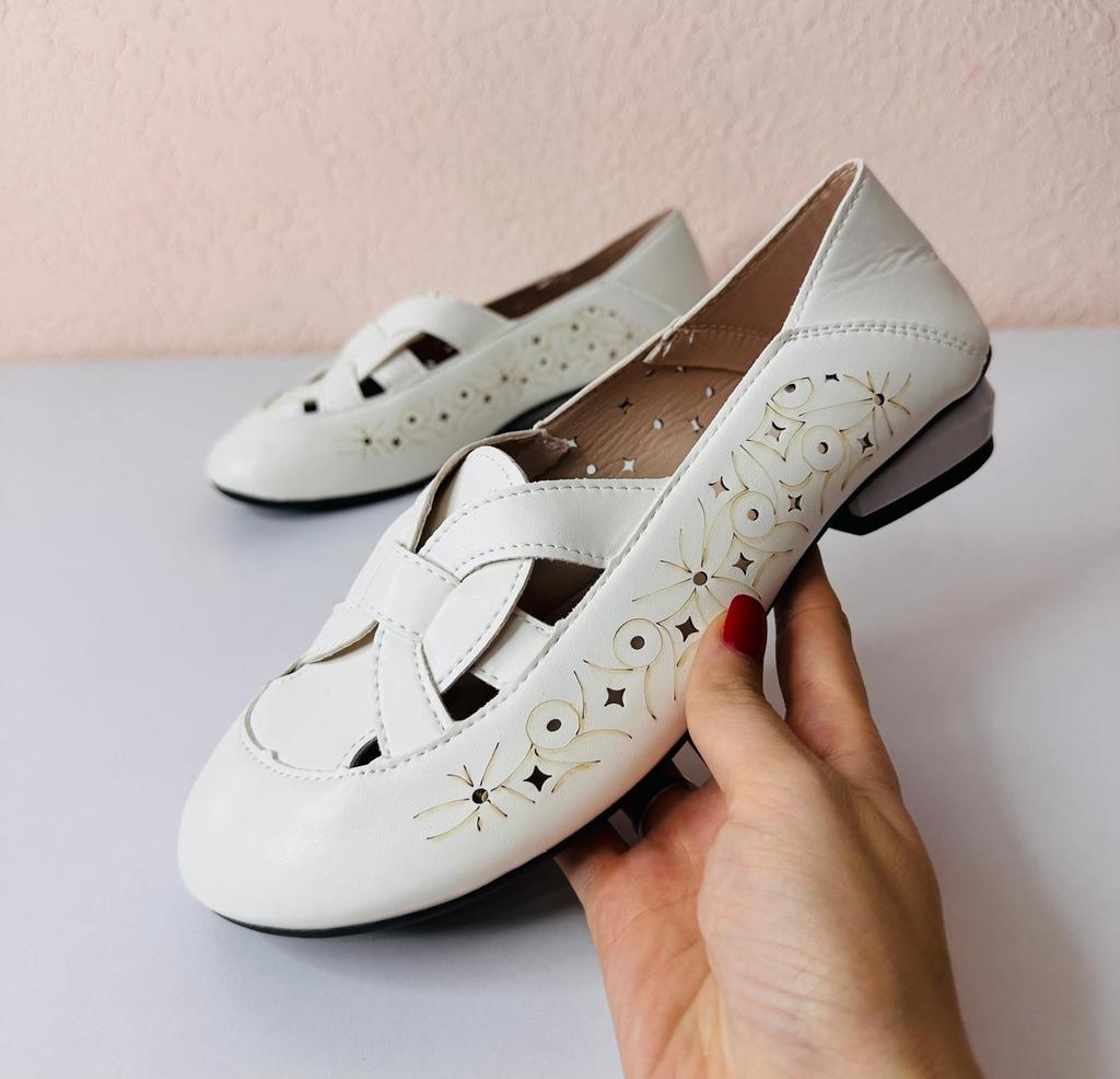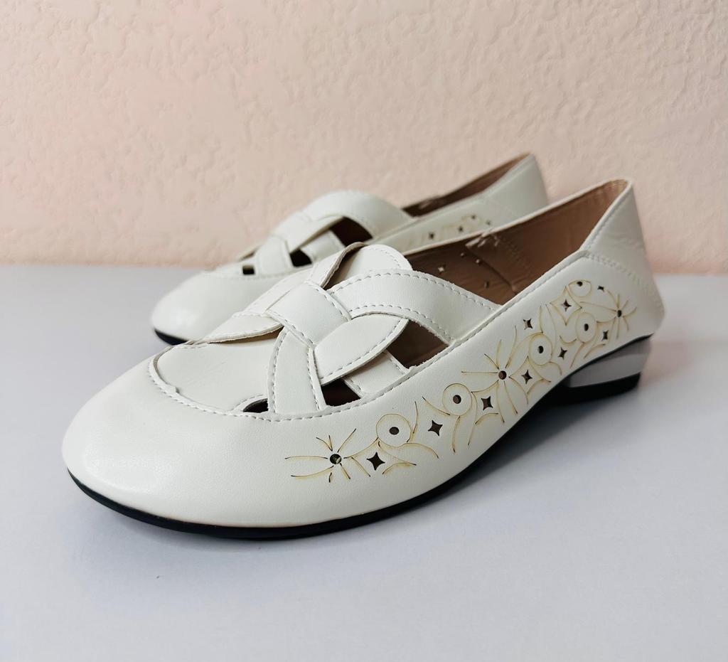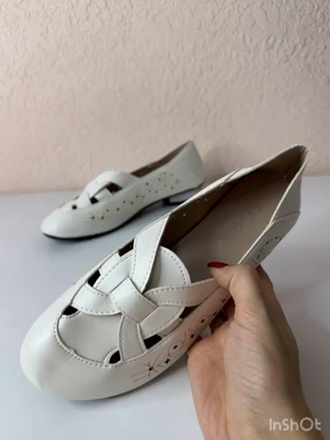 Lightweight and comfortable shoes🤍 White, soft eco-leather, sit very comfortably and elegantly on the foot. Suitable for warm spring and even summer. They are breathable, with see-through circles and rhombuses in the pattern on the sides, the top is also openwork. The insole inside is soft, as if it has foam inside, very comfortable for the foot. Small heel, good sole. I would definitely wear it)) Size 23.5 is slightly too big. Size 38 is perfect for a foot size of 24cm. It's not worth taking a larger size, they run true to size. Details shown in the video. Made neatly, factory-made. The price is pleasant. Not rough, the eco-leather is soft.. I highly recommend it 🧡