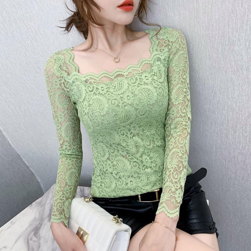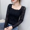 Lace Base Layer Women's Spring Autumn Beautiful Square Neck Inner Slim Fit Long Sleeve T-shirt Top
