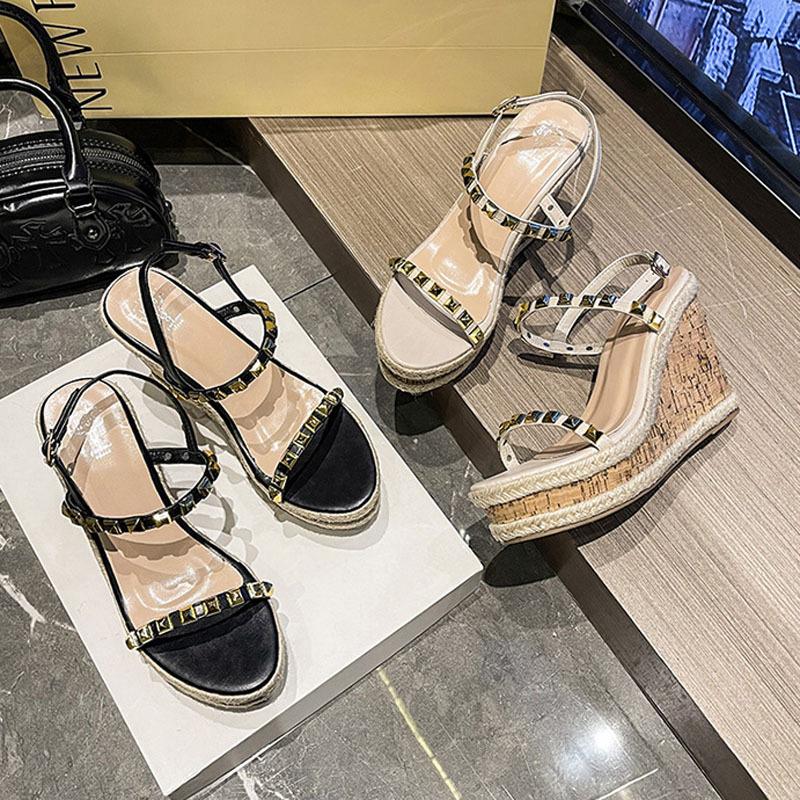 Women's Sandals Spring New One-word with Simple Rivet Wedge Heel Platform Sandals Women