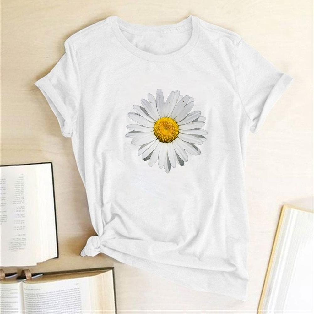 Summer Round Neck Daisy Pattern Printed Top Fashionable Casual Pure Cotton Short Sleeved Women's T-shirts