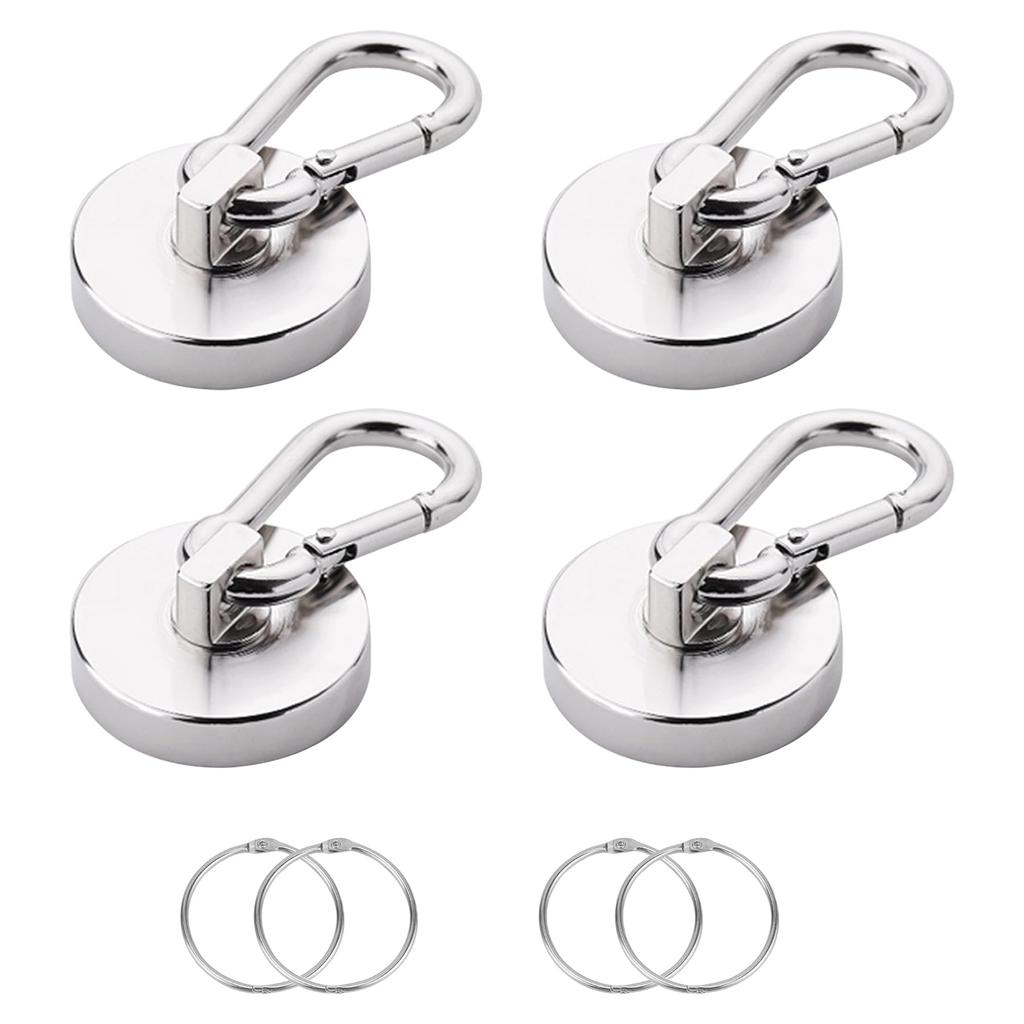 Product Specifications: 4 carabiner magnets, 4 iron rings. Magnetic hook size: 42mm diameter, 19.5mm height, 9mm magnet thickness, weight: 109g, vertical load capacity: 68kg. Material: Neodymium magnet, strong magnet.