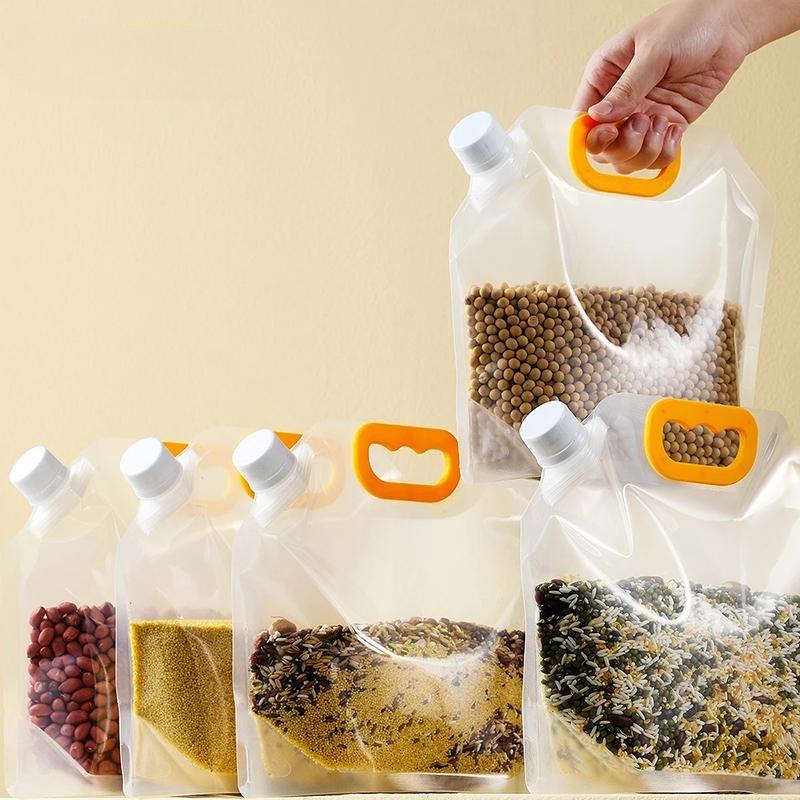 3.【Uniquely Designed】Plastic handle and large outlet diameter ,improve grain storage bags practicality,allowing you to easily fill grains alone. Easily fit into your cupboard or freezer which enables you to get the kitchen organized and frees up space in the pantry.