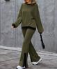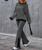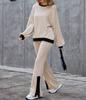Women's Ribbed Knit Set Long Sleeve Top and Wide Leg Pants with Black Contrast Trim In Beige