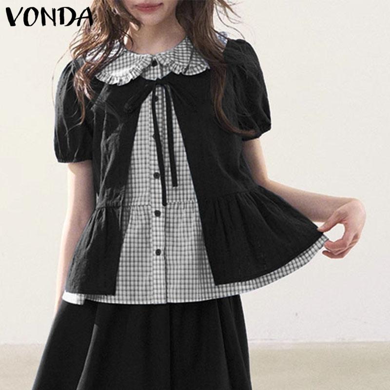 VONDA Women Girls Puff Sleeve Bow Knot Fake Two-piece Plaid Casual Blouse