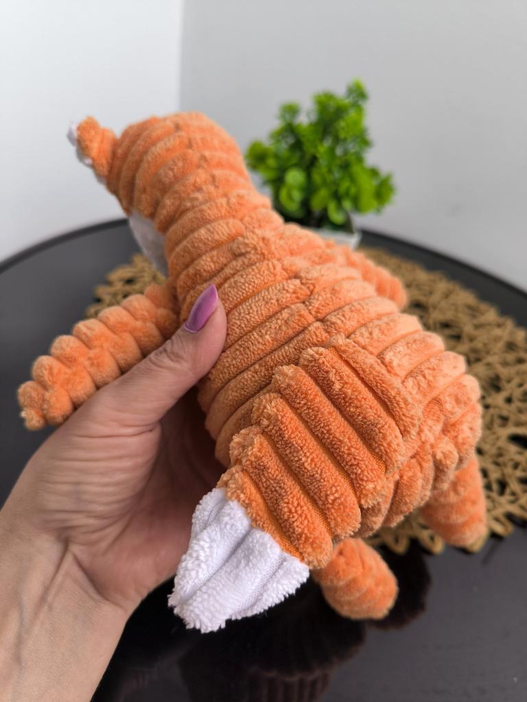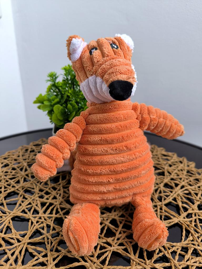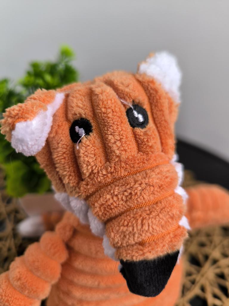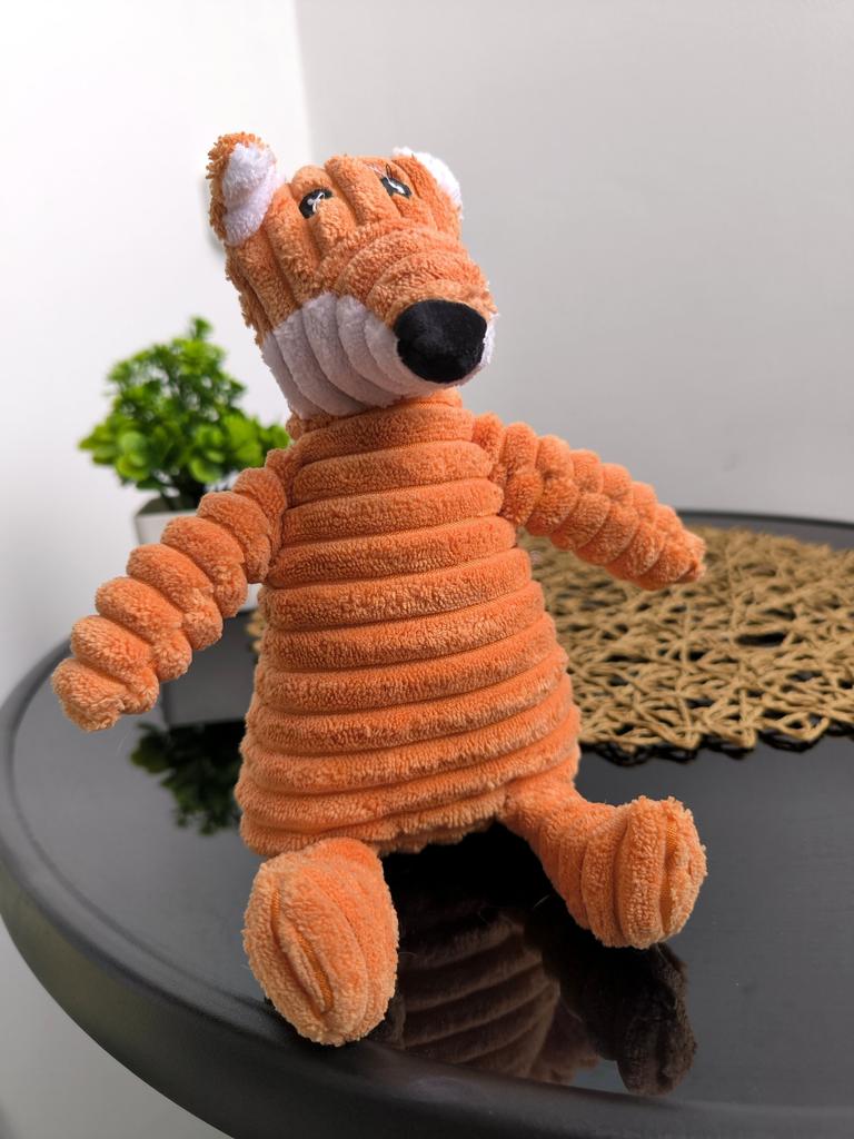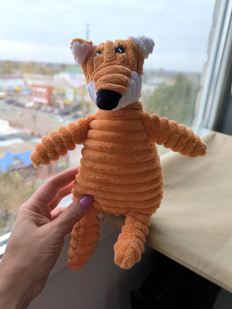 Plush toy for dog – makes a sound and is interactive I bought this toy for my dog, and he just loves it! 🐶 The size (16×26 cm) is perfect – not too small and not too big, it's easy for him to grab in his mouth and play with. The soft texture of the plush gives the impression that it is both pleasant to the touch and relatively durable – it has already survived several "shaking" sessions and has not fallen apart.. What really upgrades it is the sound – the toy makes a noise when bitten, and that excites the dog every time anew. It doesn't get boring, and that's great for keeping him occupied when I'm not available to play. The funny design in the shape of a cartoon animal also adds a smile to us 🙂 This is a perfect toy for a dog that loves games with sound, also soft, also cute, also durable – really worth the price!