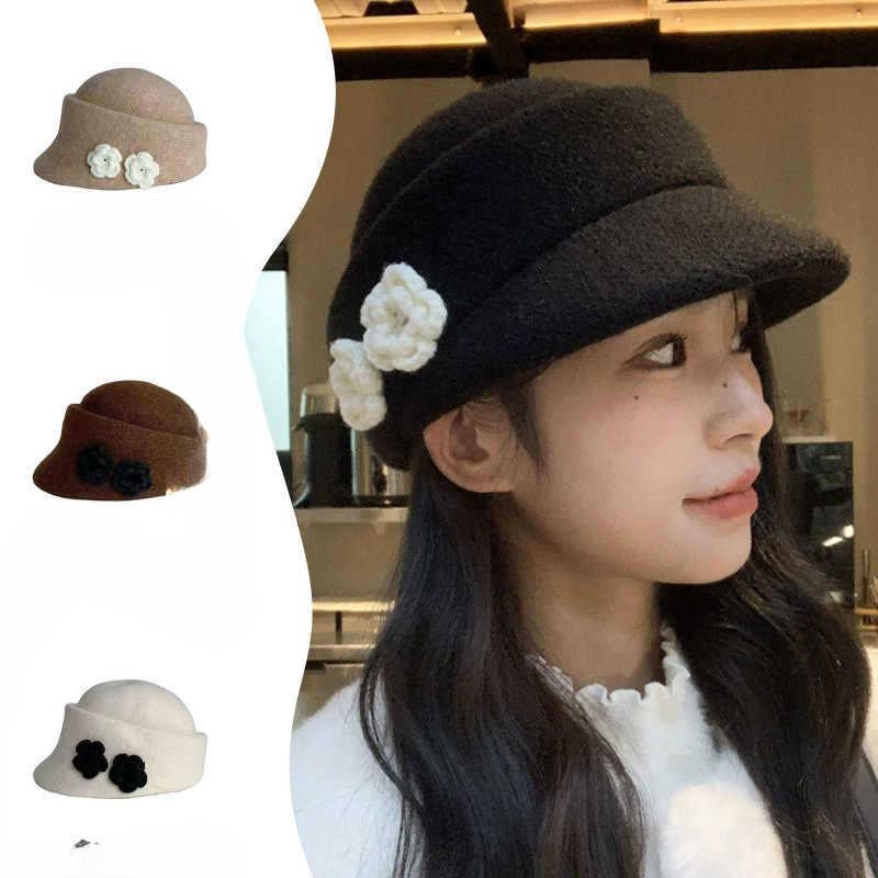 Autumn and Winter Hats for Women Knitted Flower Equestrian Hat Korean Face Showing Tabloid Hat Ins Style Big Head Circumference Baseball Cap