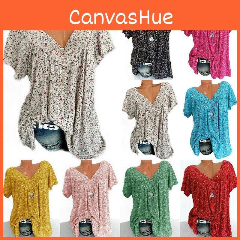 Women V Neck Floral Tee Tshirts Short Sleeve Blouse Summer Tunic Tops Plus Size