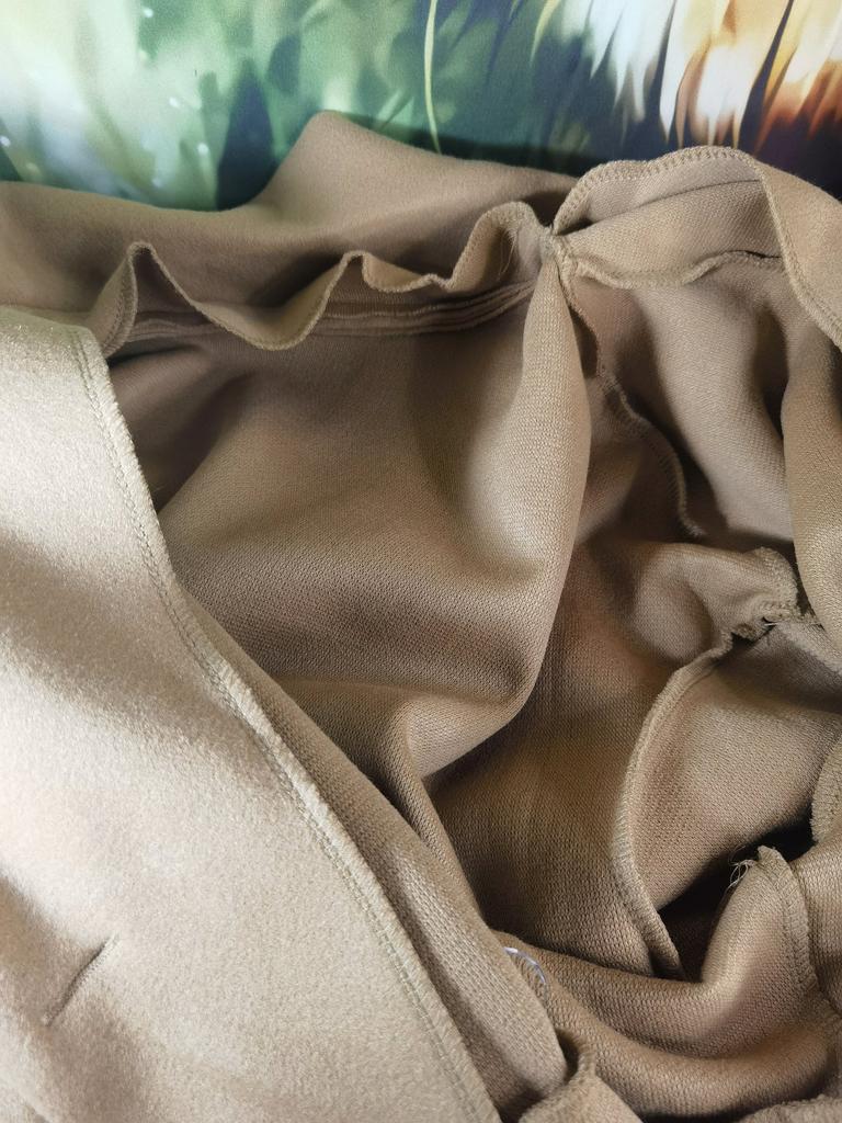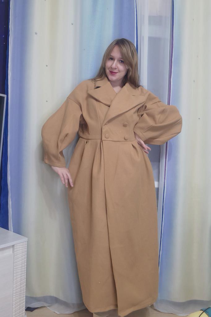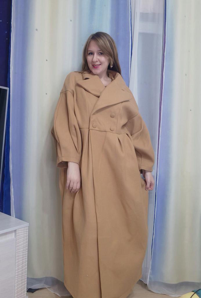 The color is nice. Size L for our 50-52. But the quality... very thin, unlined... And without a belt, it looks not very good somehow.