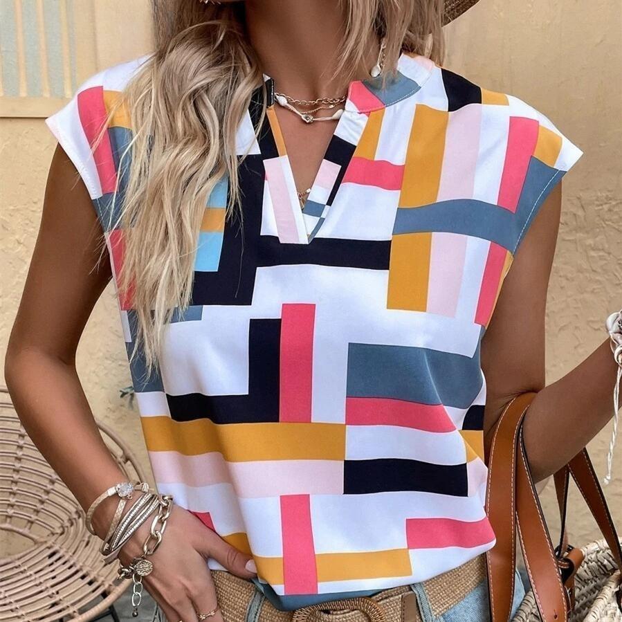 Women's Fashion Summer Spring Casual Geometric Print Sleeveless V-Neck Blouses & Shirts