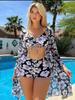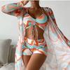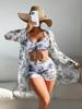 This stylish three-piece swimsuit set is designed for women who appreciate both European and American fashion trends. Featuring a playful print drawstring bikini, the set is completed with elegant flat-leg pants for comfortable coverage. Additionally, a chic mesh cover-up adds a layer of sophistication and versatility, perfect for making a statement at the beach or poolside. Made entirely from polyester, the swimsuit set is lightweight and durable, ensuring both comfort and longevity. With its distinctive pattern decoration, this set offers a unique and fashionable look for summertime fun.