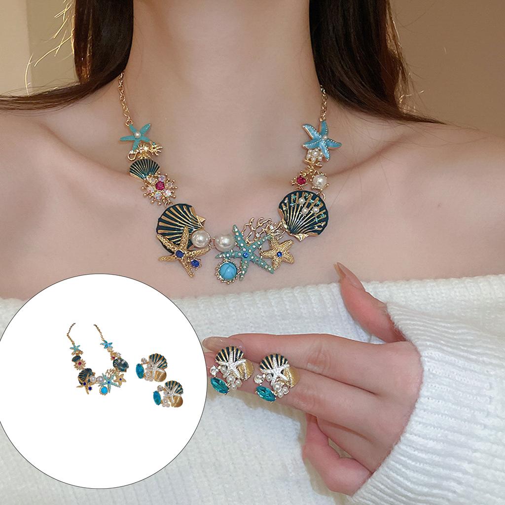 Elevating your styles with this oceanics inspire necklace and earring set, crafted from alloy, crystals, and imitation pearls, featuring intricate starfish, shell, and coral styles for beach lovers and jewelry enthusiasts.
