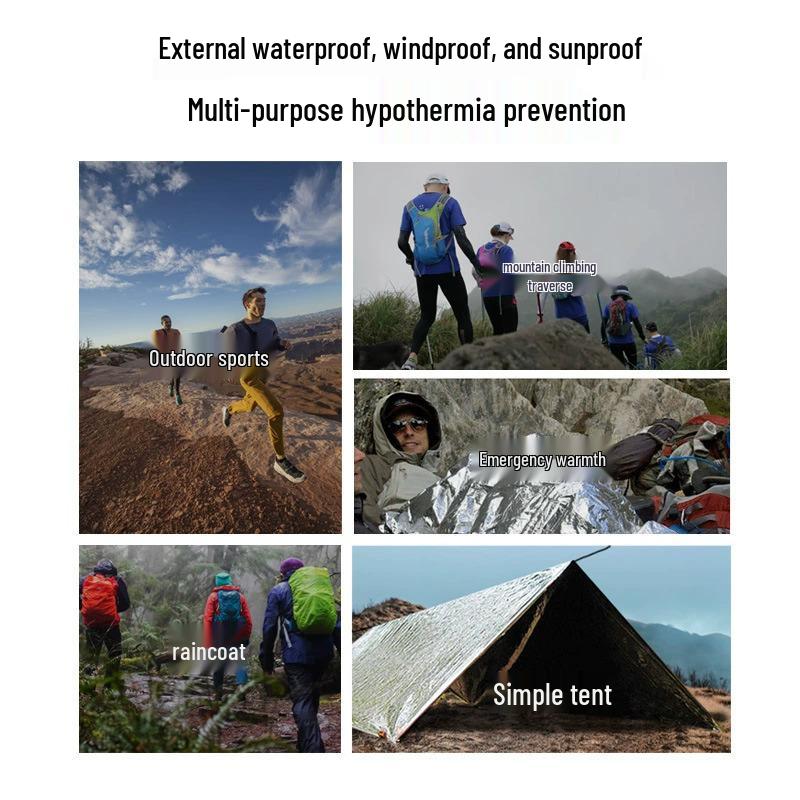 Portable Outdoor Emergency Blanket: Multifunctional, Waterproof, Insulating, for Camping, Earthquake, Cold & Sun Protection.