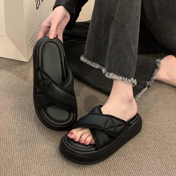 Stepping On Shit Slippers Women's Summer Wear 2025 New Muffin Thick Bottom Non-slip Cross Velcro Beach One-word Drag