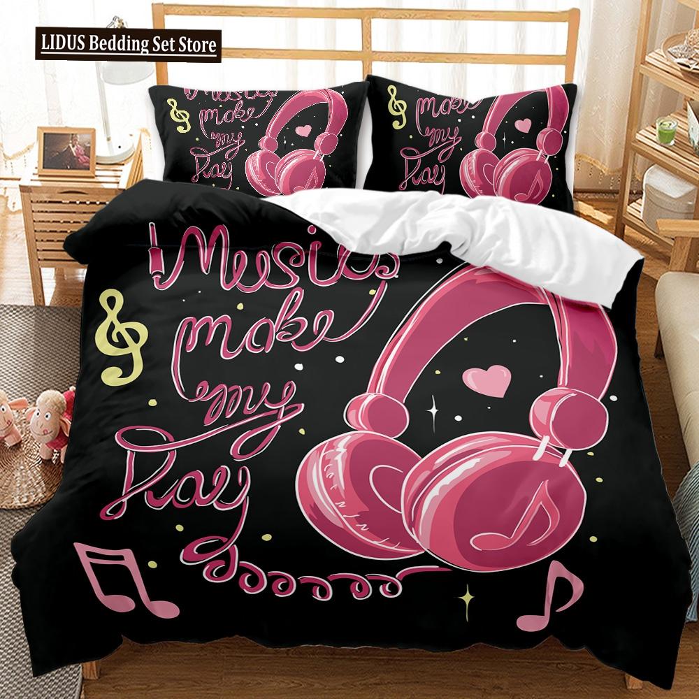 Headphones Duvet Cover Set Rock Music Melody Note Comforter Cover Pink Headset Polyester Bedding Set For Kid Boy Girl King Size